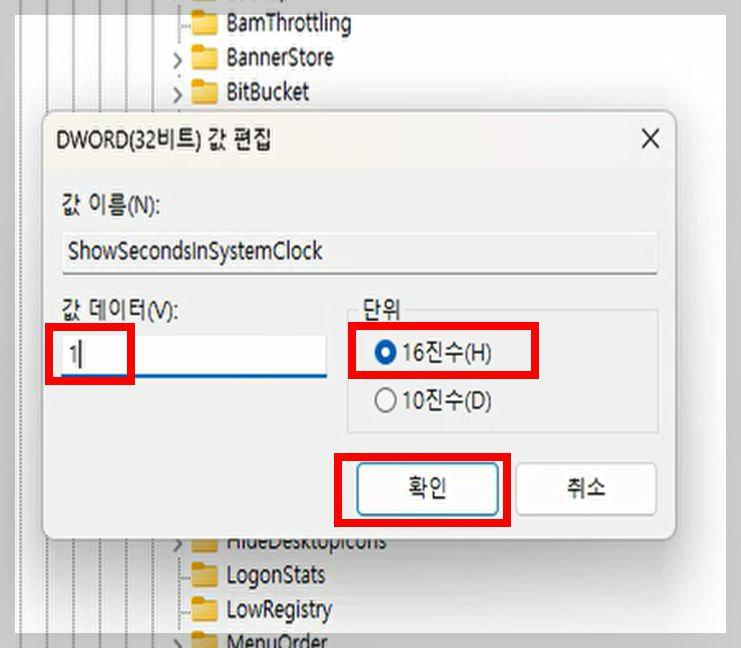 여섯째, "ShowSecondsInSystemClock" 을 더블클릭 해주시면 "DWORD(32비트) 값 편집" 창이 나오는데, 두 번째 줄에 있는 하얀 공간에 1 을 입력해 주시고, 우측에 "단위" 에서 16진수를 선택해 주십니다.