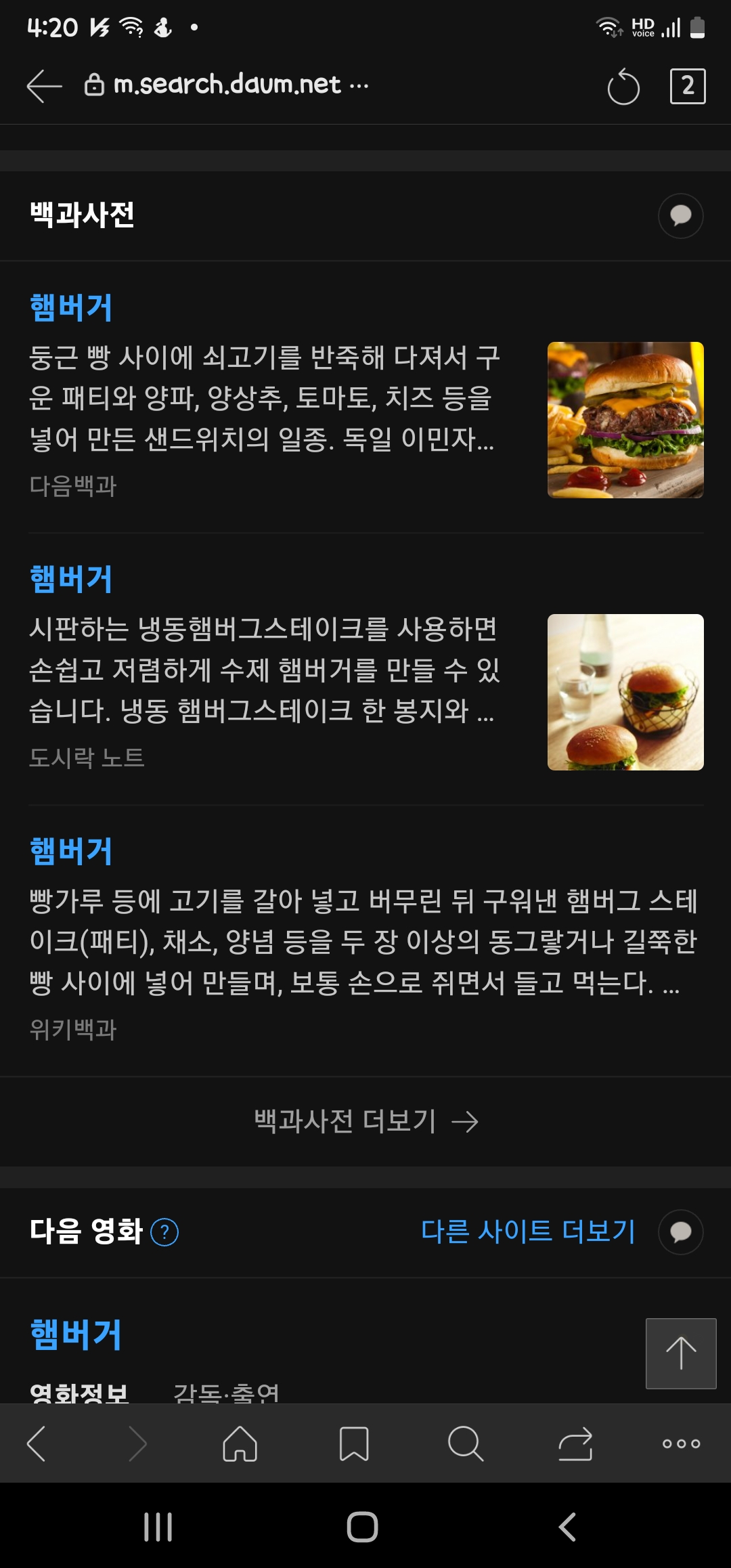 검색된 햄버거 사진은 와이드 하지 않습니다. 사진의 왼쪽에는 햄버거라는 단어를 가진 포스팅의 제목, 그리고 요약된 내용이 적혀 있습니다. 그리고 우측에 약간 정사각형에 가까운 사진이 나옵니다.