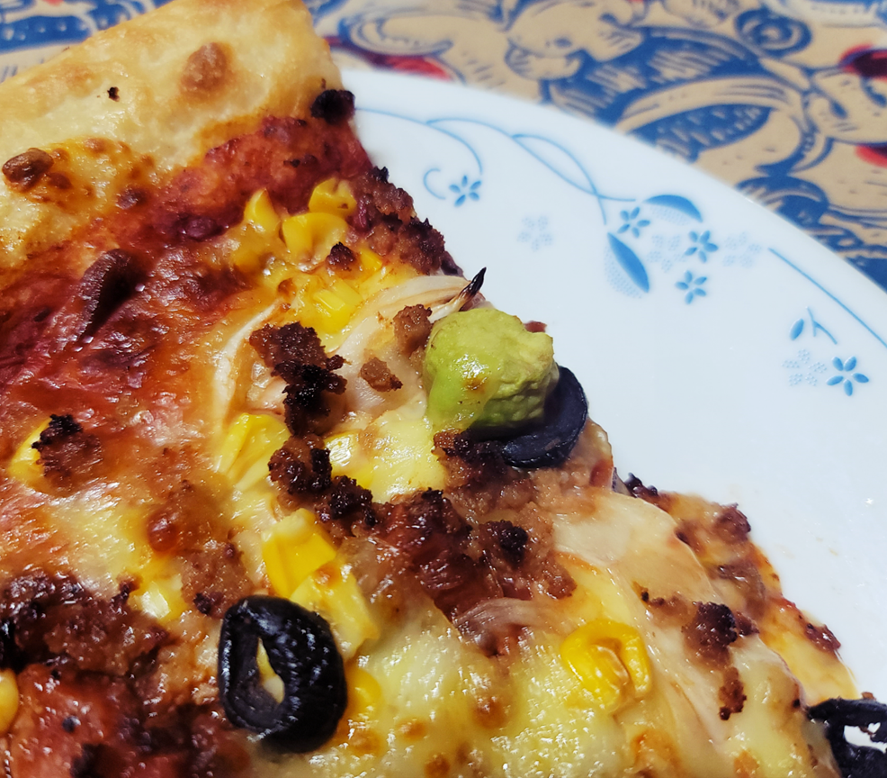 아보카도가 중간 중간 들어가 있는데, 전반적인 피자의 베이스는 불고기 피자라고 할 수 있겠습니다. 불고기 피자에 아보카도가 좀 들어간 피자라고 생각하시면 편하겠습니다.
