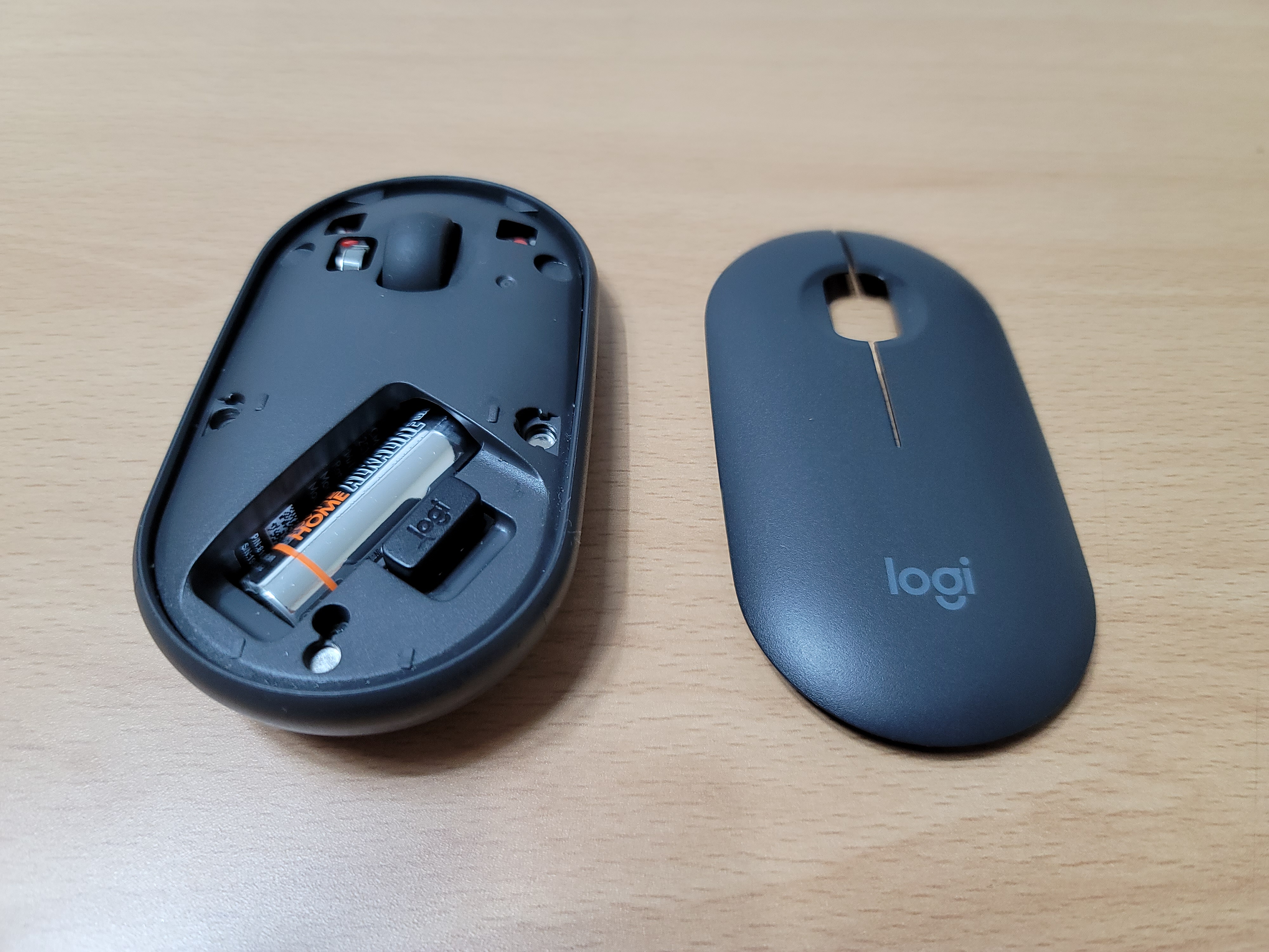로지텍 페블 마우스의 내부를 열어보는 것은 매우 간단합니다. 뚜껑 부분이 자석식으로 되어 있어서 특별히 힘을 가해서 서 뚜껑을 개폐하지 않아도 됩니다. 자석식 탈부착 방식을 택한 것은 매우 좋은 아이디어라고 생각되며, 자성 역시 적절하여 의도치 않은 분리에 대한 염려도 없다고 할 수 있겠습니다.