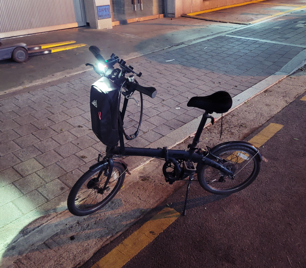 조금 더 밝아졌습니다. 참고로 저는 한강 자전거 전용 도로를 야간 라이딩 하거나 혹은 자동차들이 달리는 도로에서 자전거를 타는 경우가 아니라면 1단 밝기 정도만 사용할 것 같습니다. 1단 밝기 마저도 시내의 일반적인 소방도로나 골목길을 다닐 때는 보행자들에게 눈뽕 피해를 주는 것 같아서 조심 조심 켭니다.
