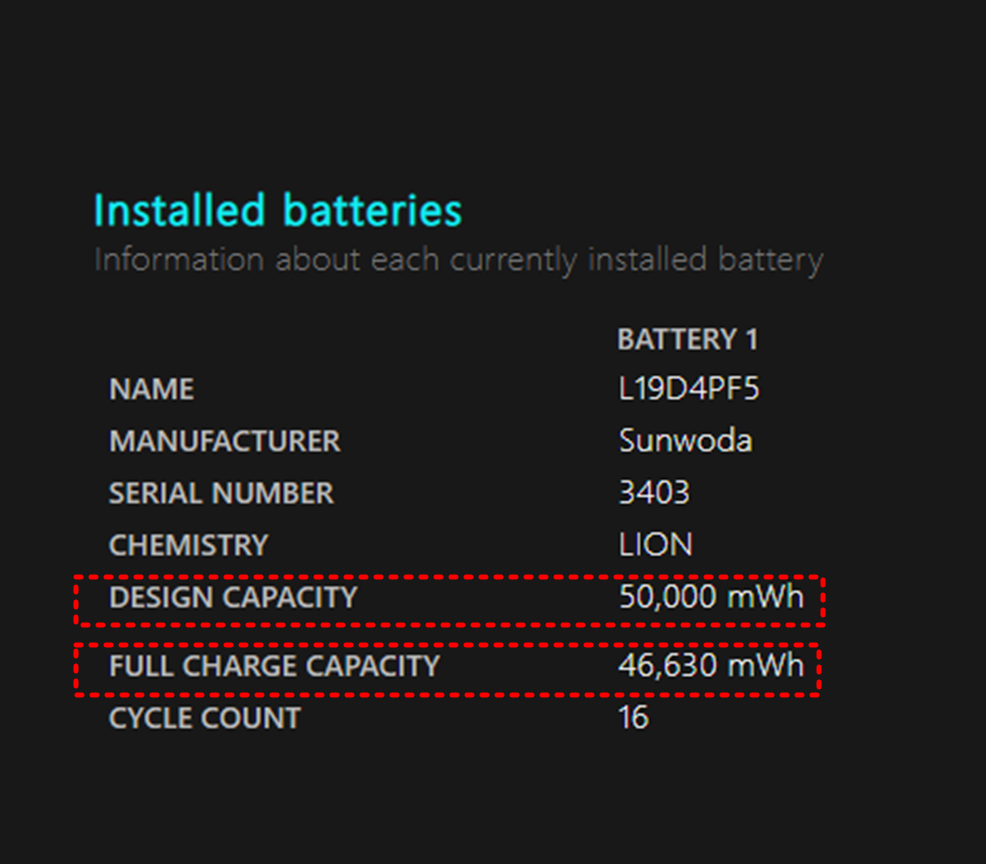 이제 우리는 이 배터리 리포트 화면에서 배터리 웨어율을 계산하기 위한 자료들을 얻을 수 있습니다.