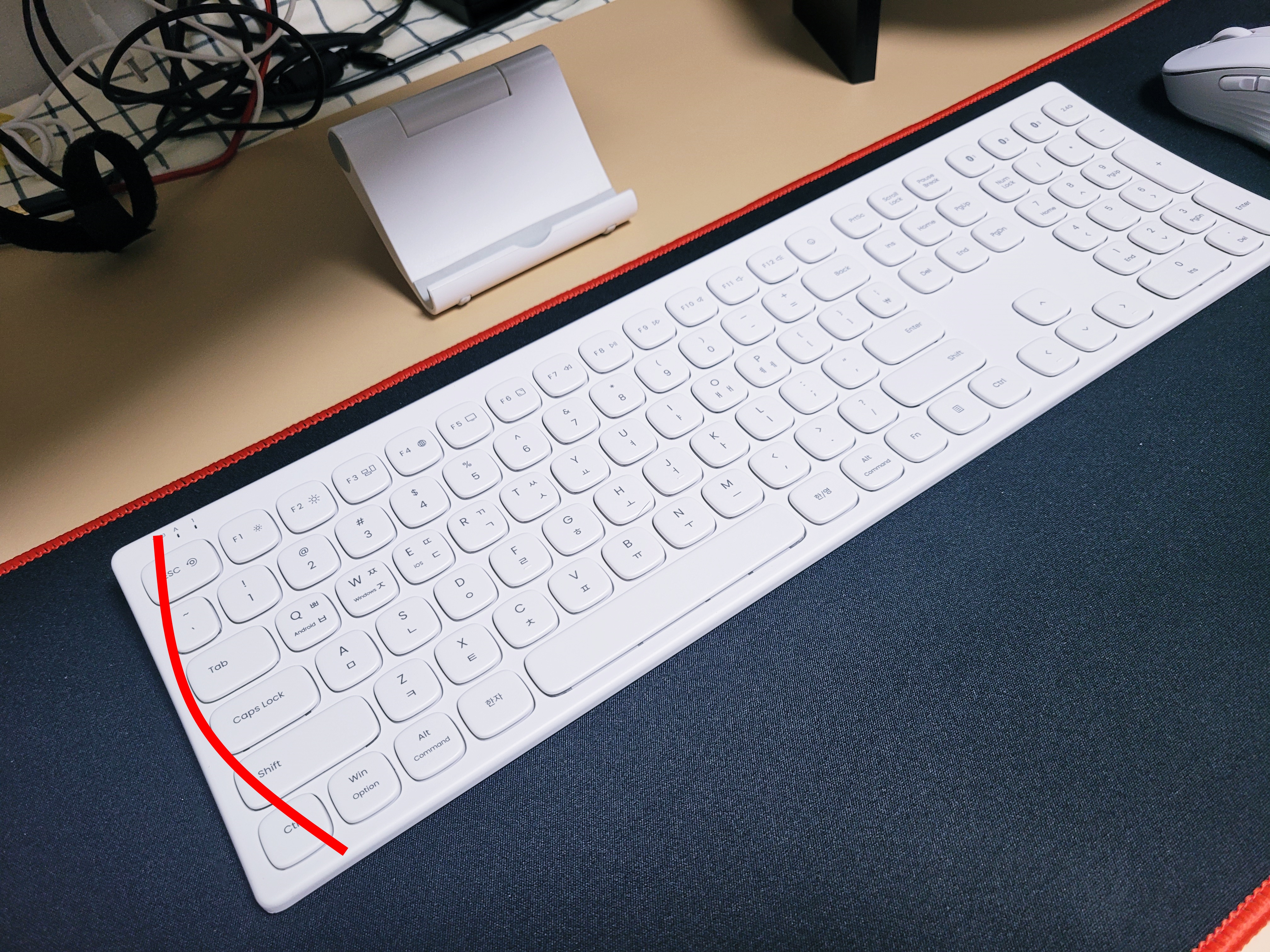 사진상으로는 잘 못느끼실 수 있는데, 일반적인 키보드가 알트나 컨트롤키가 배치되어있는 키보드 하단 부터, F1, F12키등 펑션키가 위치한 상단까지 직선의 각을 가지고 있습니다. 그러나 엑토 커브드 키보드는 인체공학적인 설계로 키보드 하단에서 상단으로 올라갈 때 살짝 곡선으로 파여진 형태를 이룹니다. 물론 그 각이 눈에 띌 수준은 아니며 살짝 곡선형으로 파여저 있고, 만약 그 사실을 몰랐다면 눈치를 잘 못챌 수 준이라고도 하겠습니다.