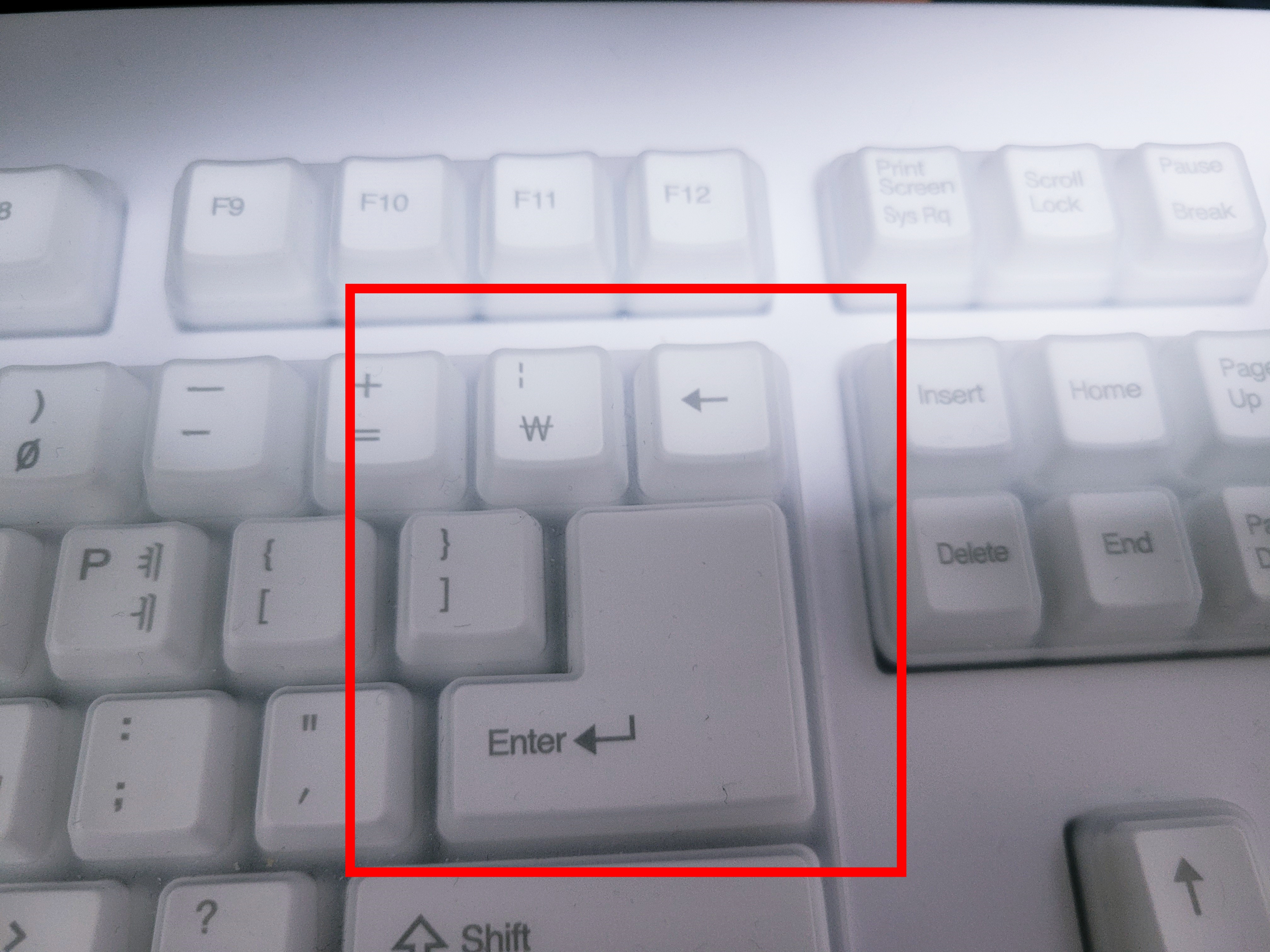 요즘은 거의 다 위 사진의 키보드와 같은 배열을 따르고 있습니다. 저 같은 경우는 백슬래쉬 키를 은근히 자주 사용하고, 백스페이스는 매우 많이 사용하는 편인데, 이 자주 사용하는 두 키가 사이즈가 작고, 위치가 요즘 키보드 배열과 다르다는 것이 조금 더 익숙해져야할 부분이라고 할 것 같습니다.