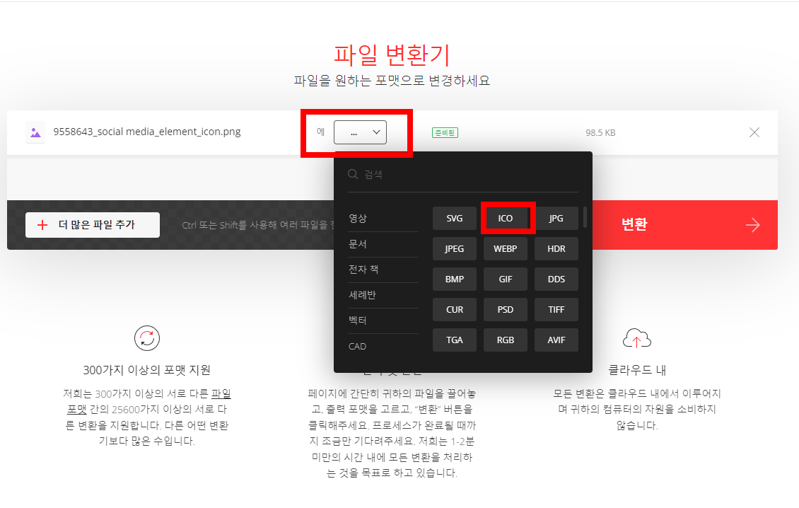 위의 화면에서 "..." 이라는 선택창을 눌러서 ICO 버튼을 눌러줍니다. ICO 파일로 변경을 하겠다는 뜻 입니다. 이 사이트는 ICO 버튼 변환 외에도 다양한 포맷의 파일 변환을 지원하는 듯 합니다. 아래에도 여러가지 포맷들이 나옵니다. 아무튼 여기서는 아이콘을 만들기 위함이니 ICO 버튼을 선택해 줍니다.