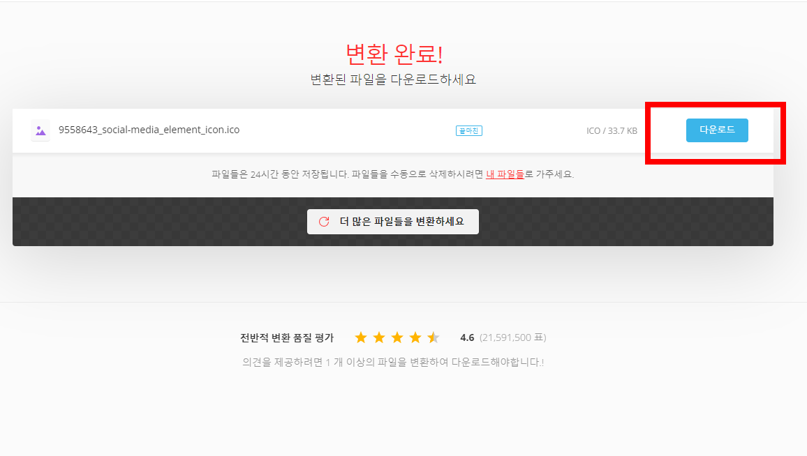 변환 완료창이 뜨면 사진에서와 같이 다운로드 버튼을 눌러서 변환이 완료된 아이콘을 다운 받습니다. 다운된 파일은 본인 컴퓨터의 다운로드 폴더에 저장이 됩니다.