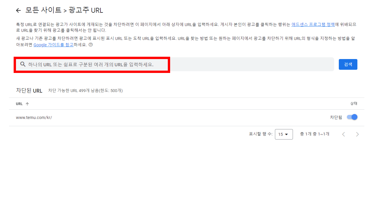 다섯째, 광고 차단 URL 입력창에 WWW.TEMU.COM 이라고 입력해 주고 우측의 파란색 검색버튼을 눌러줍니다.