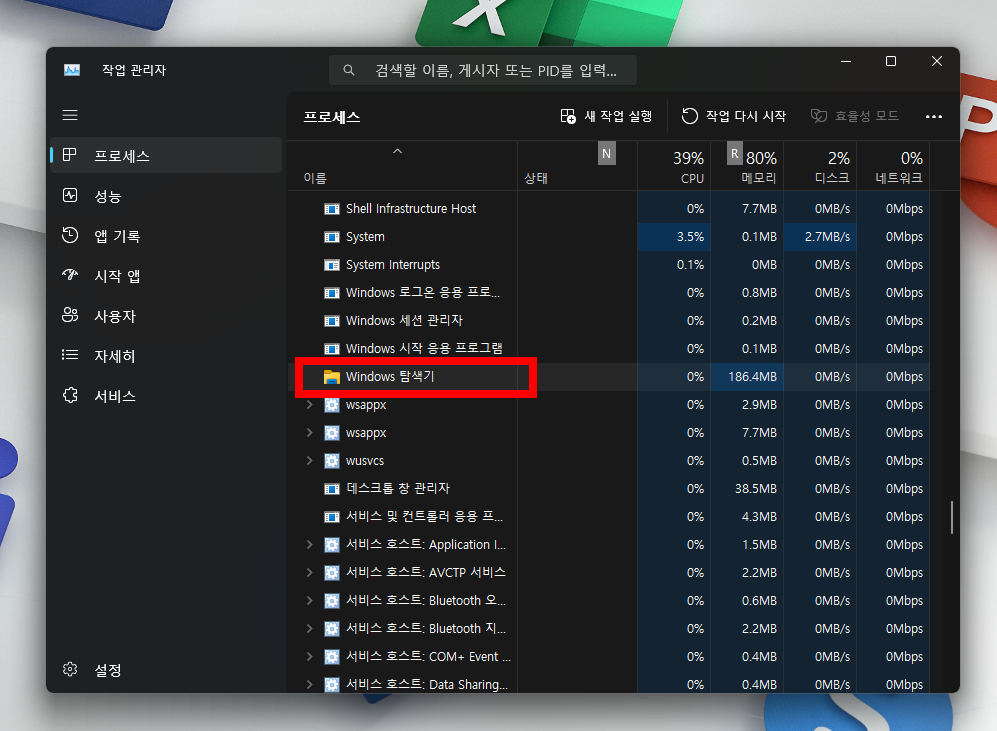 셋째, 스크롤을 아래로 다운해서 Windows 탐색기 백그라운드 프로세스를 찾아줍니다.