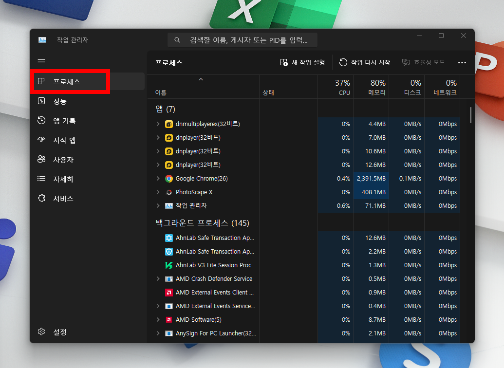 둘째, 좌측 카테고리에서 프로세스를 선택해 줍니다.