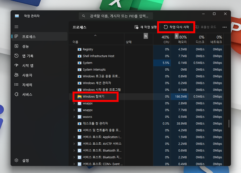 넷째, 작업관리자의 우측 상단에 있는 작업 다시 시작 버튼을 눌러 줍니다.
