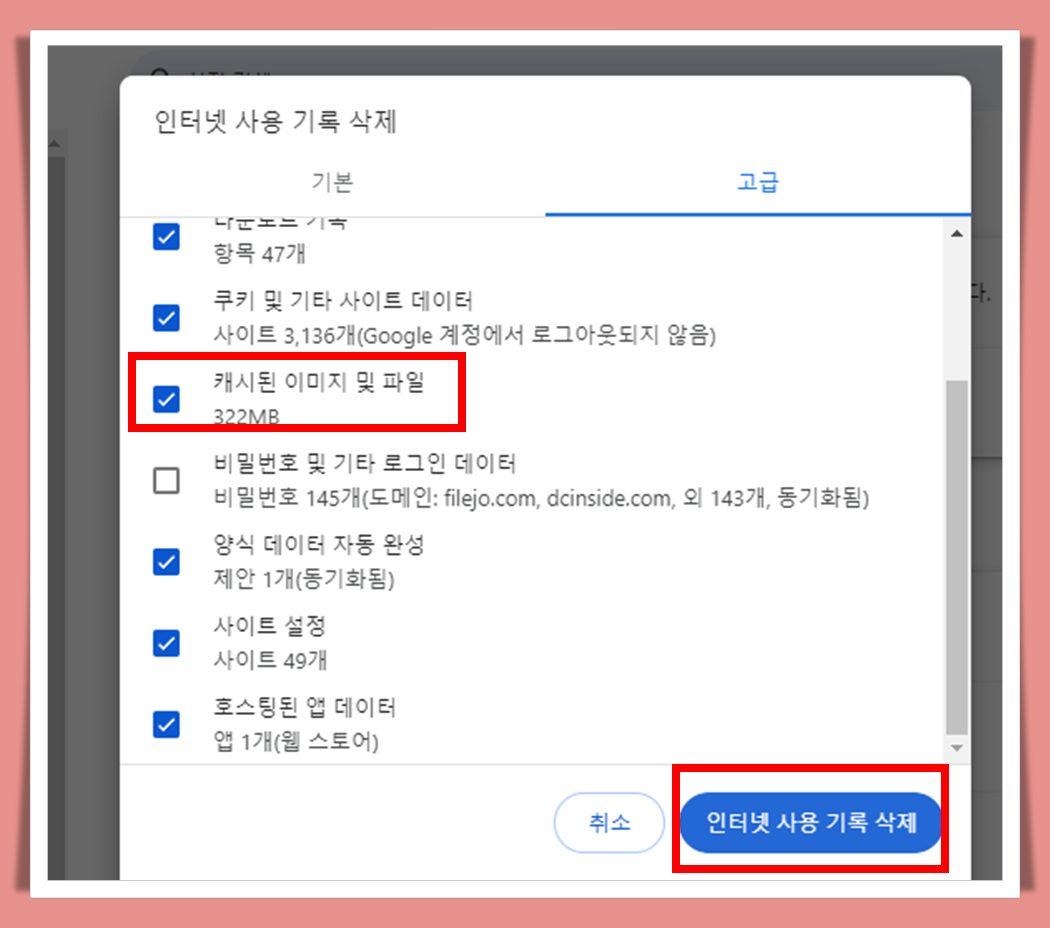 셋째, 인터넷 사용 기록 삭제 창이 뜨면, 캐시된 이미지 및 파일을 체크해주고, 인터넷 사용 기록 삭제 버튼을 눌러줍니다.