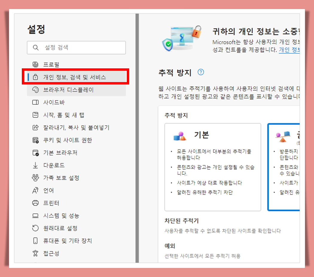 셋째, 설정에서 개인 정보, 검색 및 서비스를 클릭해 줍니다.