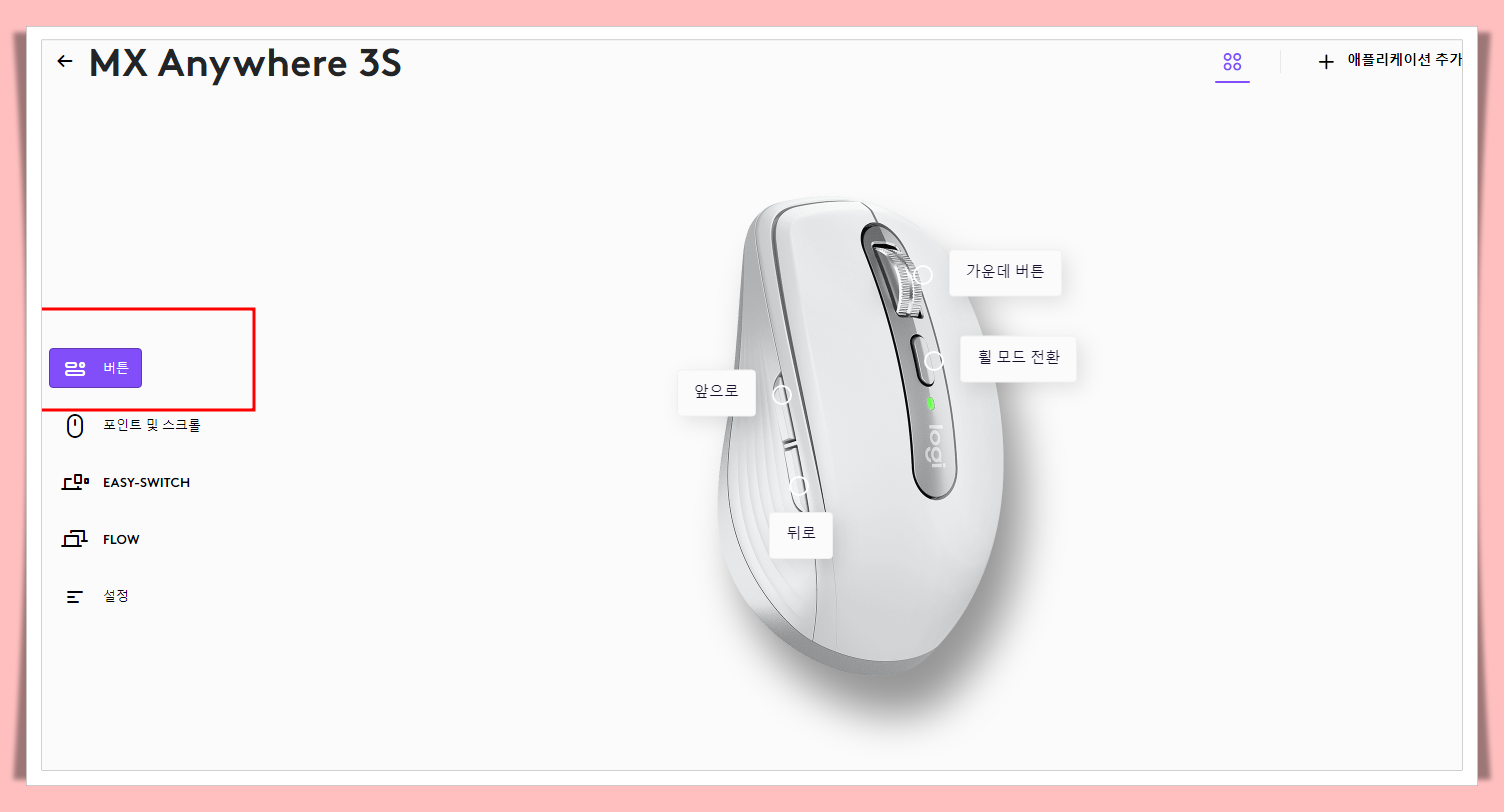 로지텍 애니웨어 3s 마우스에서 가장 많이 사용하고 또한 접근성이 높은 버튼은 사이드 버튼 두 개 입니다. 두 개의 사이드 버튼 중 하나는 앞으로 가기, 하나는 뒤로 가기로 기본 설정 되어 있습니다. 사진상으로 보았을 때 빨간색으로 표시해 둔 부분이 앞으로 가기 버튼 이고, 그 아래에 있는 버튼이 뒤로가기 버튼 입니다.