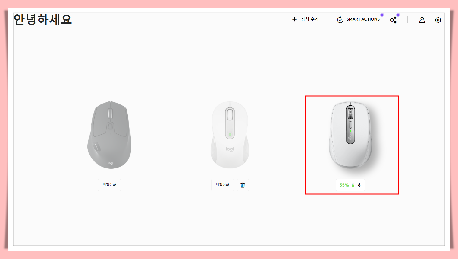 첫째, 로지옵션스 플러스를 실행시켜주고 현재 연결되어 있는 마우스를 선택해 줍니다.