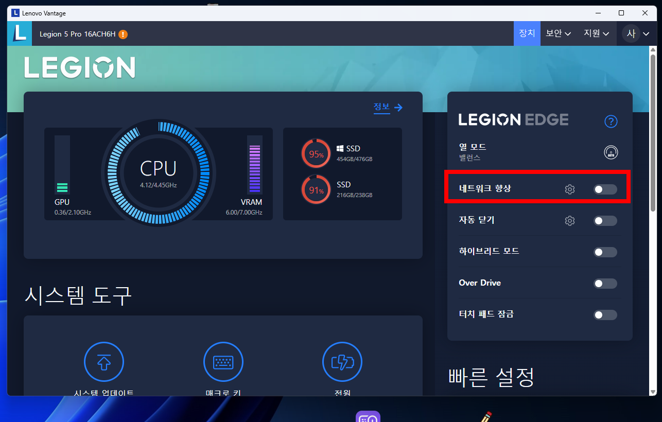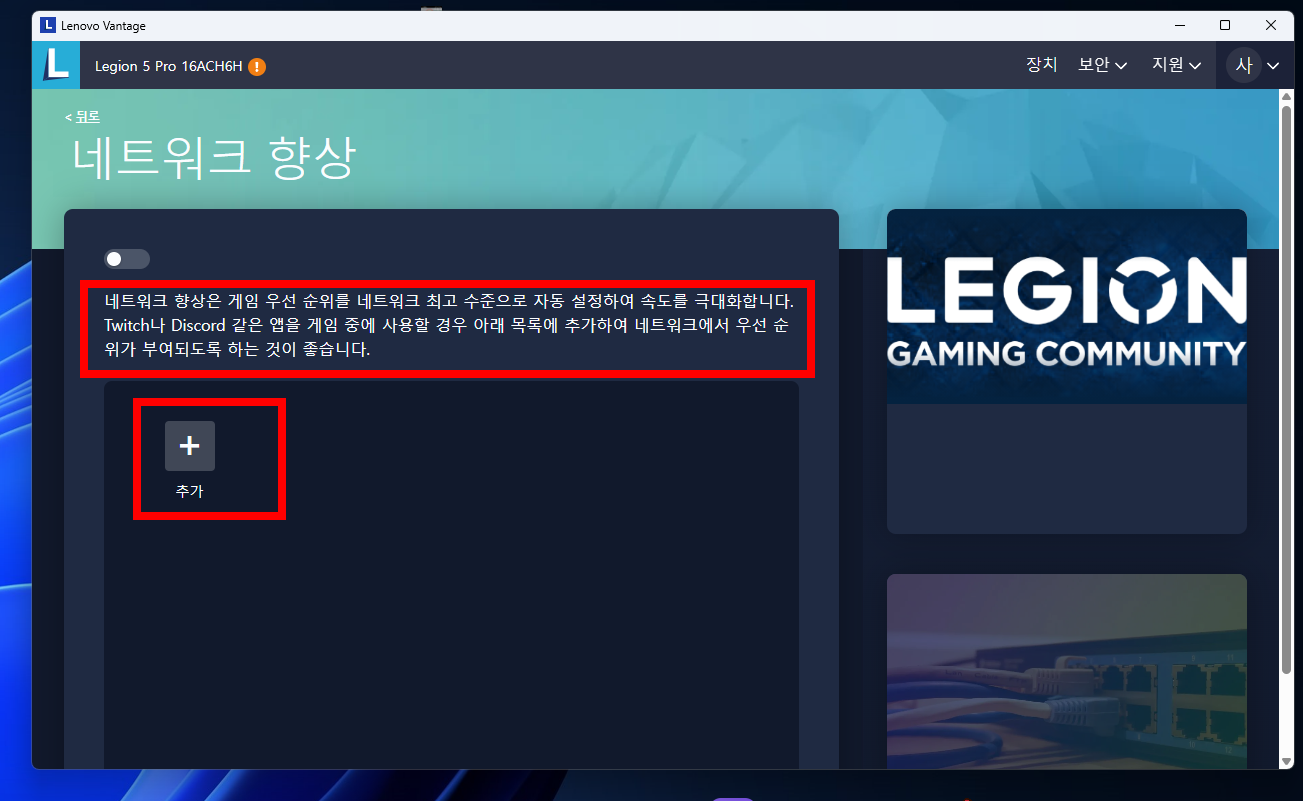 레노버에서 게이밍 랩탑에서 제공하는 LENOVO VENTAGE 프로그램에는 몇가지 게임을 위한 특이한 기능들이 있습니다. 그 중에서 "네트워크 향상" 이라는 기능이 있습니다.