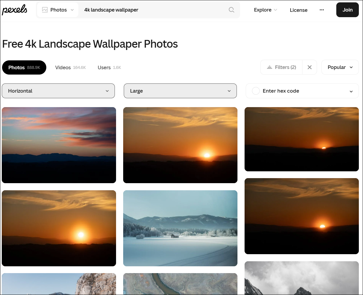 둘째, 우측 상단에 필터(Filters) 가 있는데, 컴퓨터 배경화면으로 쓰실분은 수평(Horizontal)을 설정하고, 사이즈는 Large를 설정하면 됩니다. 만약 스마트폰배경화면 사진을 찾으시는 분은 수직(Vertical)을 설정하시면 되겠습니다.