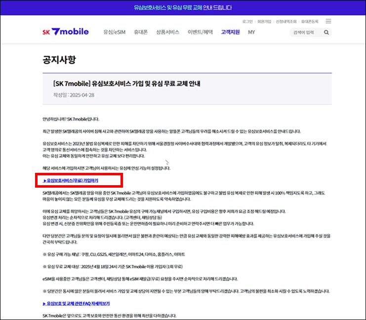 둘째, 공지사항에 '유심보호서비스(무료)가입하기' 가 있습니다. 이것을 클릭해줍니다.