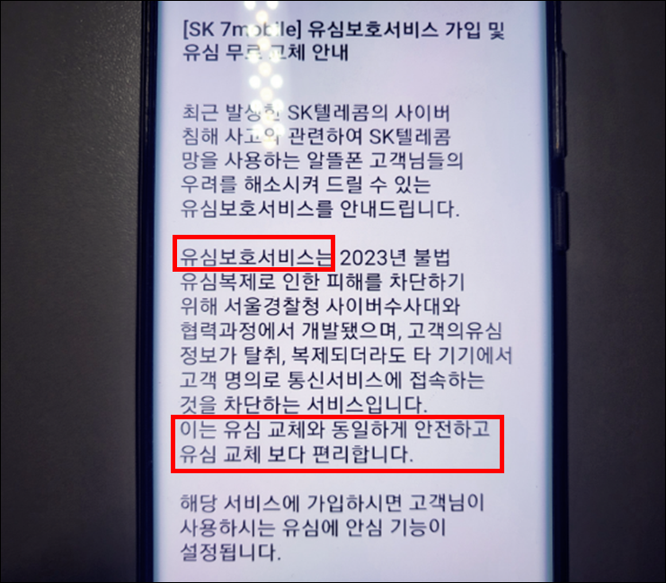 2. 유심보호서비스 안전하다는 SK7모바일 문자