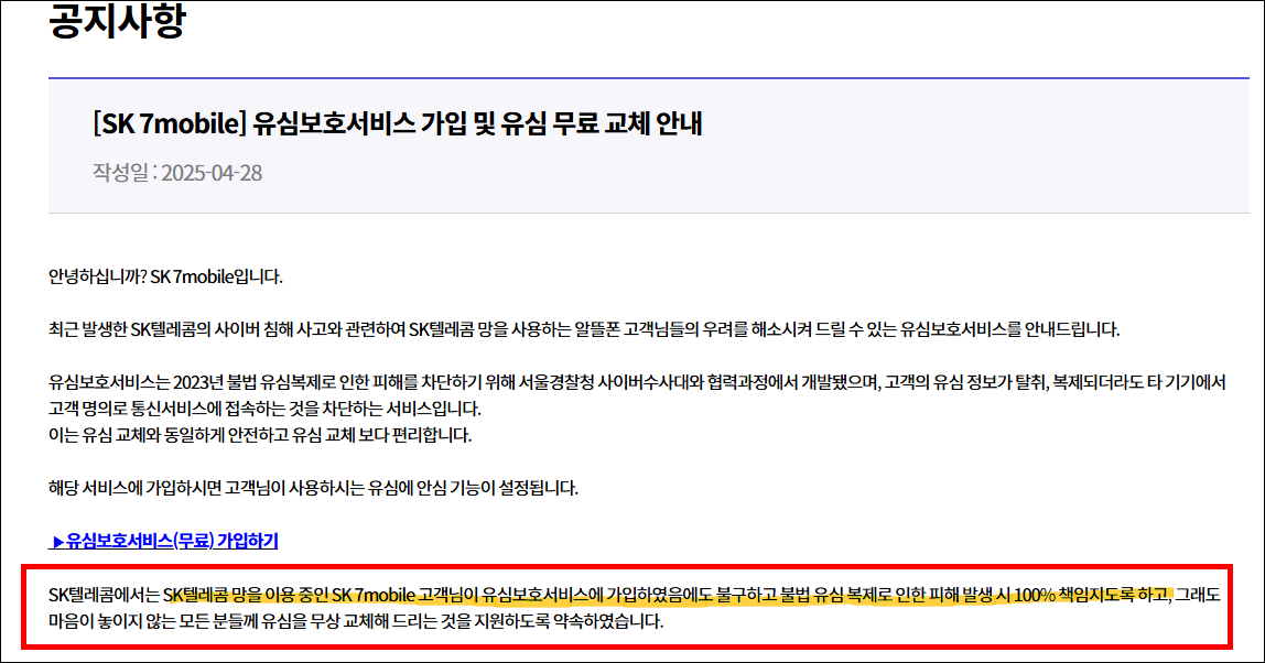 SK텔레콤에서는 SK텔레콤 망을 이용 중인 SK7mobile 고객님들이 유심보호서비스에 가입하였음에도 불구하고 불법 유심 복제로 인해 피해를 받게 되면 100% 책임지겠다고 합니다.