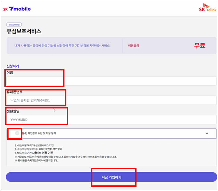 유심보호서비스 가입 요금은 무료입니다.