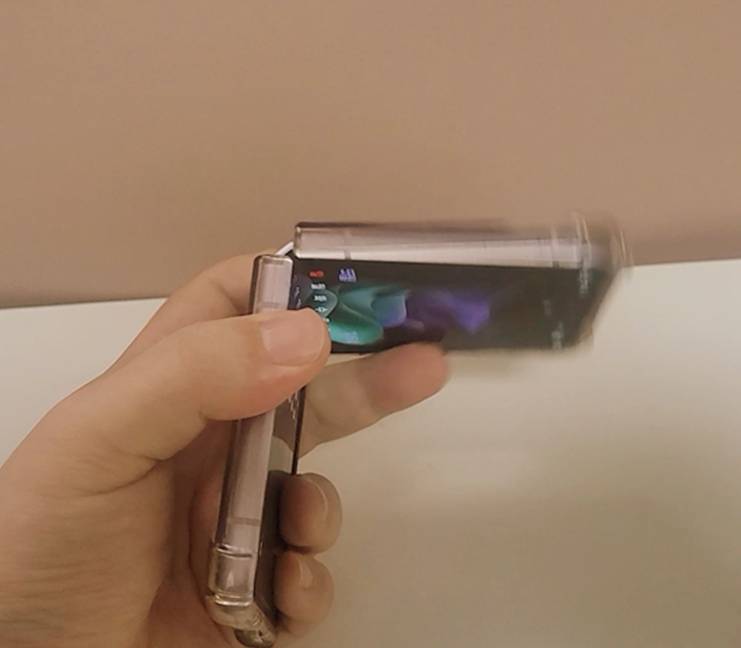 그냥 Z플립3 스마트폰 꺼내서 평소에 감대로 폰을 잡아주고 사이드버튼 2연타 해주고 그대로 손가락 위치 두면 끝입니다.