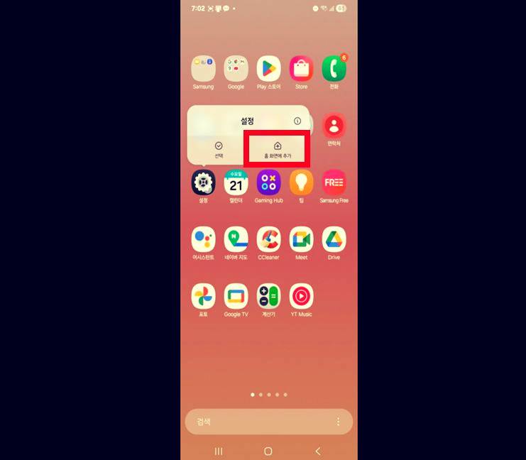 셋째, 설정버튼을 길게 눌러주시면 선택창이 뜨게 되고, 홈화면에 추가를 눌러 주시면 됩니다.