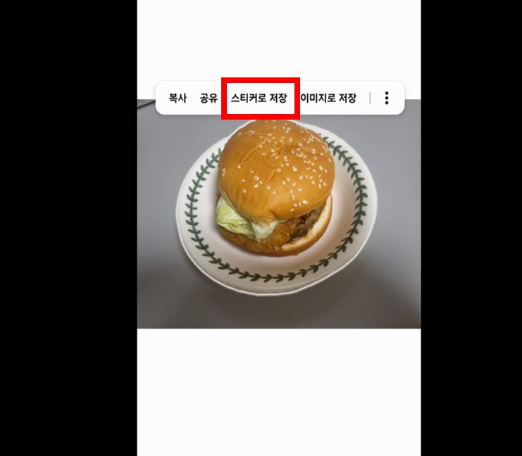 선택창에서 스티커로 저장을 누릅니다. 이렇게 되면 배경은 모두 삭제된 딱 햄버거 사진만 나오는 스티커가 만들어집니다.