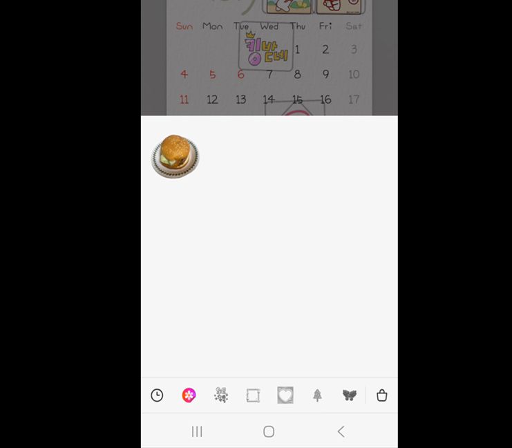 이 중에서 스티커를 누르시면 아까 만들었던 햄버거 스티커가 나오게 됩니다.