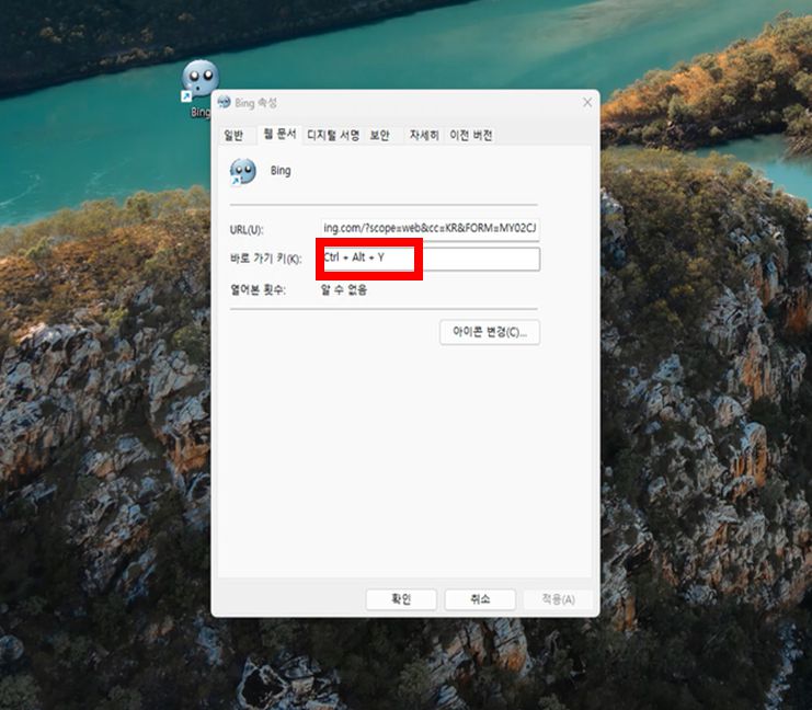 셋째, '바로 가기 키(K):' 옆의 빈 공간에 단축키를 입력해 줍니다.