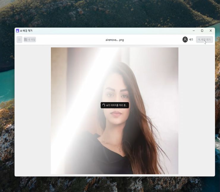 셋째, AI 배경 제거 창이 새롭게 뜨게되고, 이미지 열기 완료라는 문구가 뜨면, 우측 상단에 있는 배경제거를 눌러줍니다.